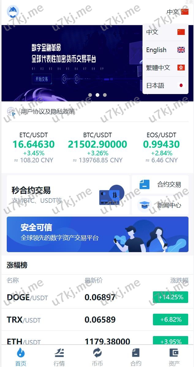 多个语言交易所系统 币币交易 秒合约交易所 pc端vue 手机端uniapp