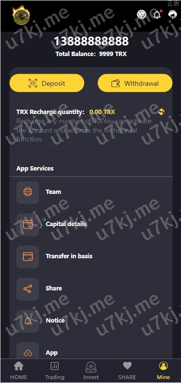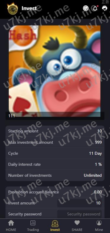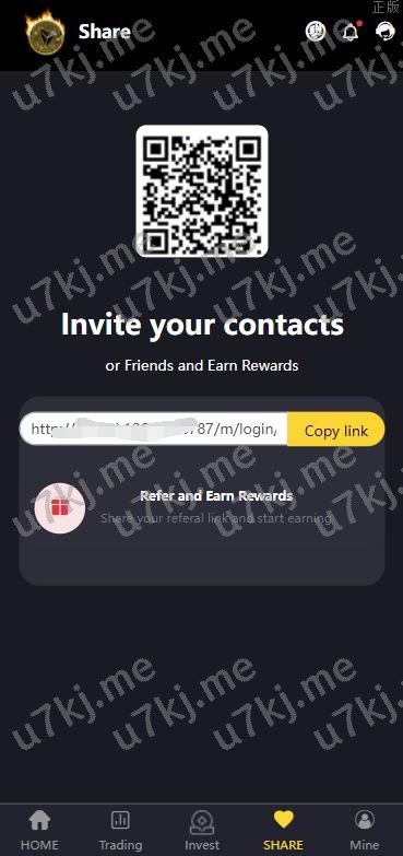5. 邀请。用户可以通过二维码或者邀请链接推广注册,通过这个邀请链接注册的用户,都会在你的下级,客户通过你的邀请链接注册后你可以得到佣金,之后下级用户充值或者获取收益你都会有返佣