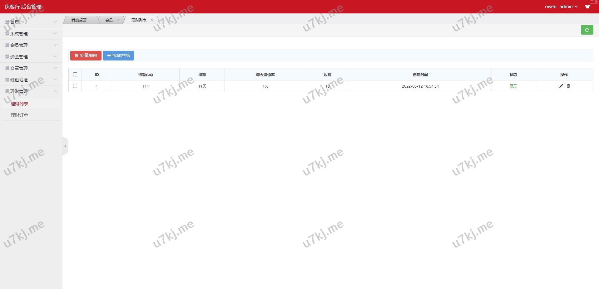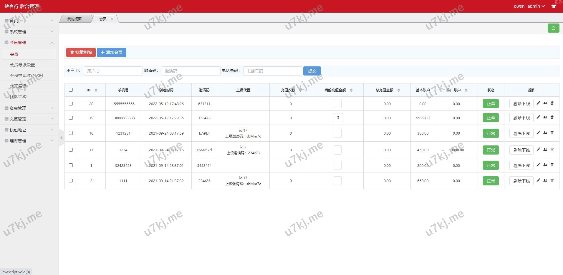 6. 会员列表,平台所有用户的信息,支持各种查询,点击pid可以查看每个用户的团队成员、基本信息、资金流水充值记录和提币记录