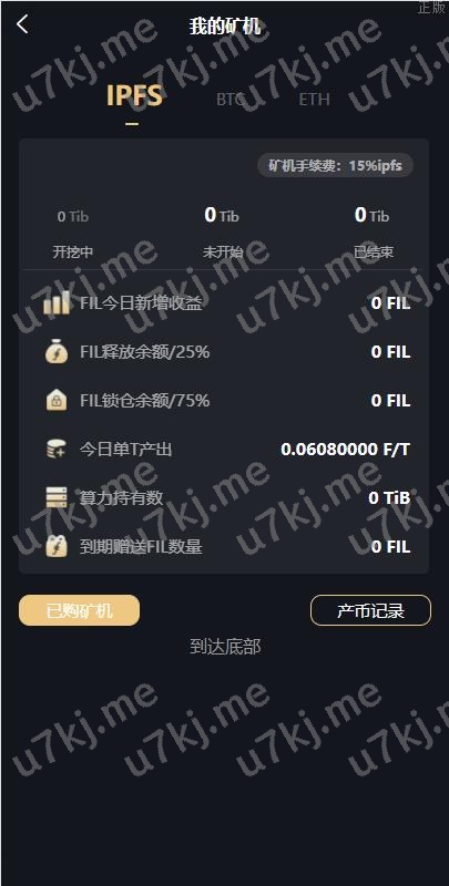 3、有效算力 封装完成算力 有效算力封装进度 有进度条 上架运行时间 报废下架时间 今日封装 单T收益 算力奖励 奖励记录 矿机列表显示购买的矿机类型 运行周期 收益日志 托管技术服务费(前端显示比例,后台可以设置比例参数,这个是在产币的时候乘以这个比例后给到用户的)