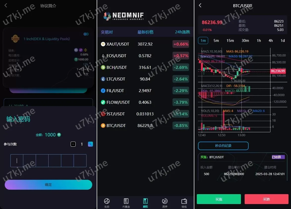 支持主流加密货币交易对(BTC/USD₮、ETH/USD₮等)。