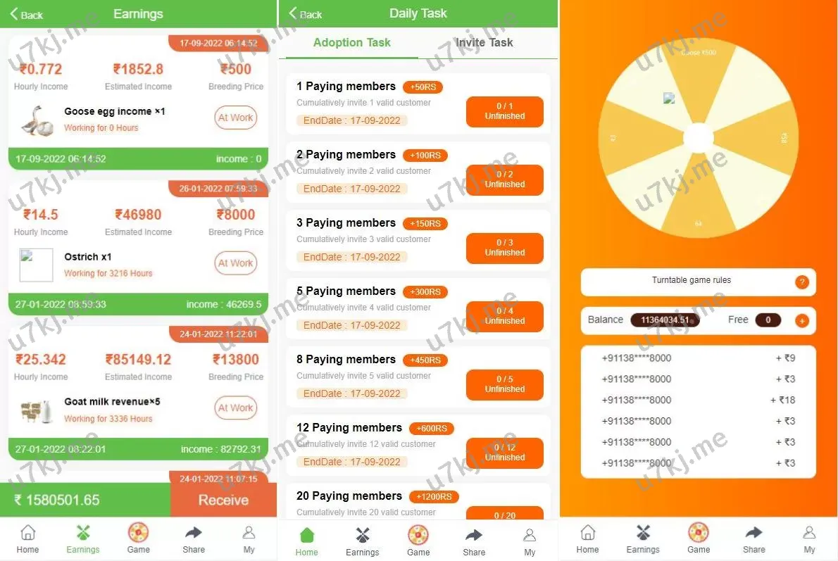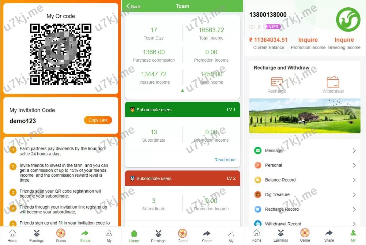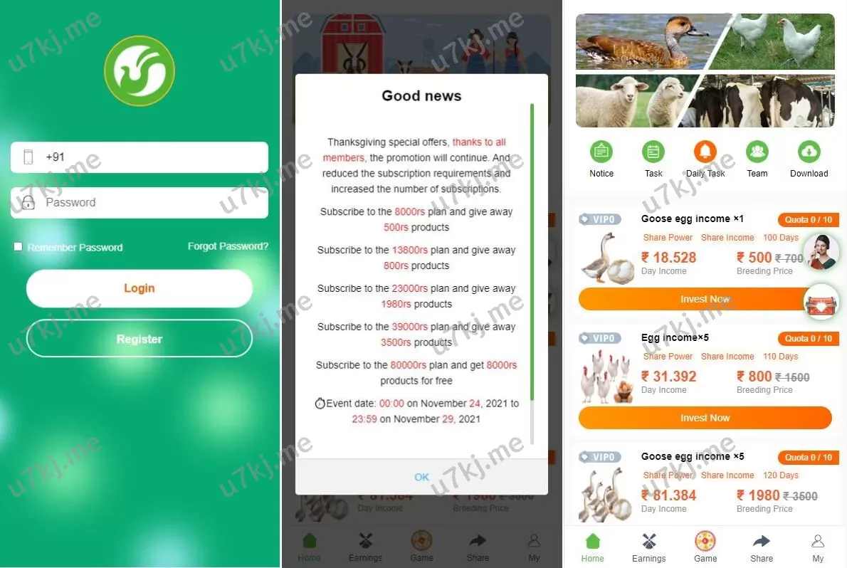 - 养殖投资模式,用户可投资养鸡、养鸭等项目获取收益